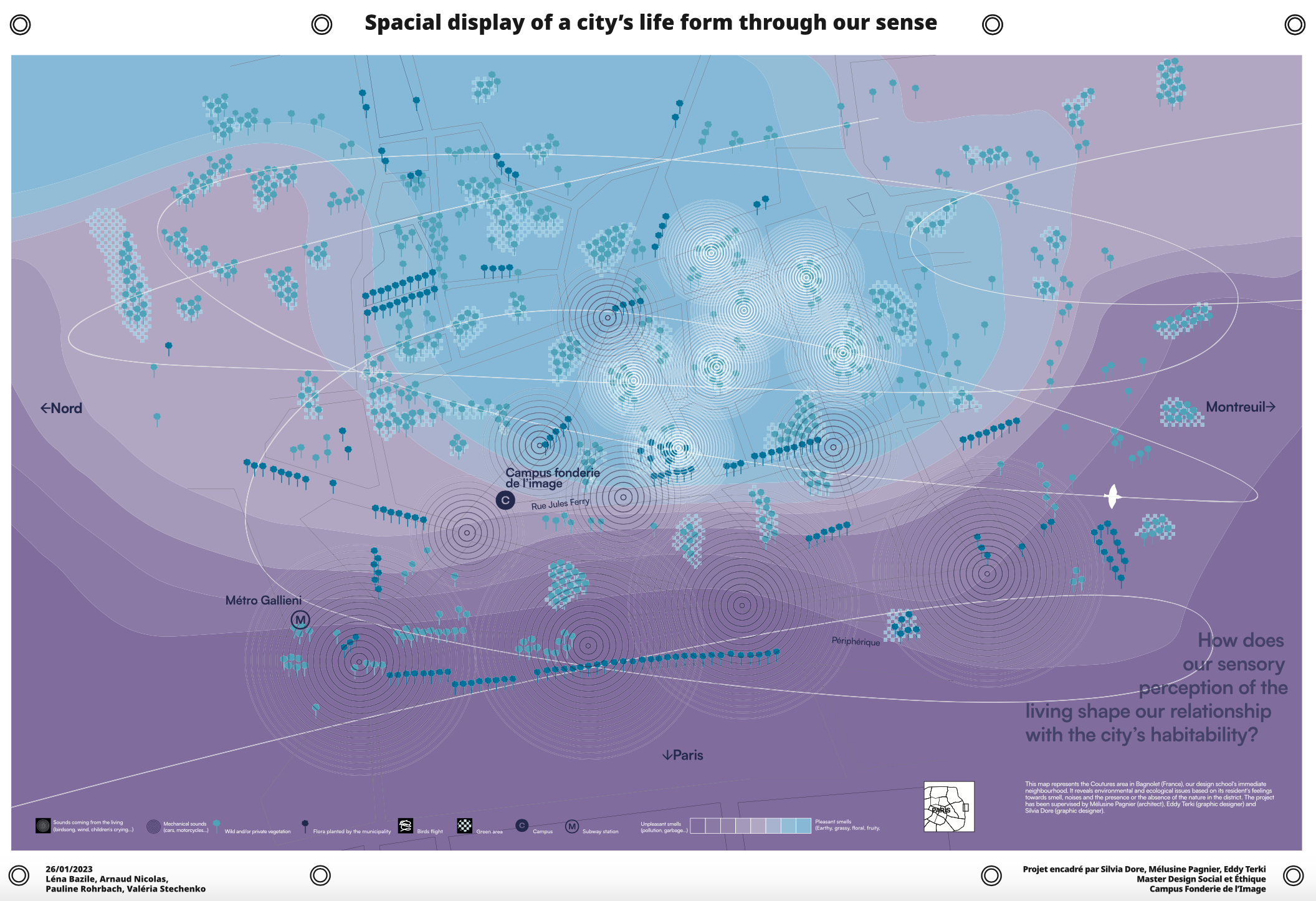 Dans ce cadre, les élèves du Mastère Design Social et Éthique ont travaillé par groupe sur trois démarches différentes, spatiales, sociales et environnementales du quartier des coutures de Bagnolet. Un travail suivi par une équipe pluridisciplinaire, avec Mélusine Pagnier, architecte chercheuse et Eddy Terki et Silvia Dore, designers graphiques et d’espace. Par des temps d’immersion territoriale, interviews et rencontres avec les habitants, les élèves ont soulevé des savoirs non visibles : le genre dans l’espace publics, la place des vivants, la perméabilité des sols, les espaces résiduels, les rapports intergénérationnels, le plurilinguisme, les odeurs, les bruits, … Ils ont développé des cartographies au travers les éléments graphiques de pictogrammes, trames, légendes, interrogeant des nouveaux rapports d’échelles.